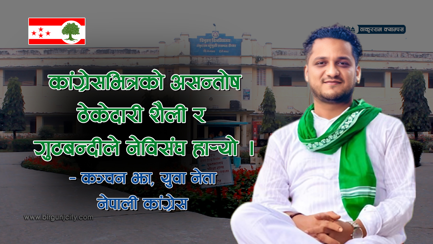 वीरगञ्जस्थित ठाकुरराम बहुमुखी क्याम्पसमा सम्पन्न स्वतन्त्र विद्यार्थी युनियन (स्ववियु) चुनावमा नेपाली काङ्ग्रेसको छाता सङ्गठन नेविसंघले पराजय बेहोर्नुको मुख्य कारण कांग्रेसभित्रको असन्तोष, ठेकेदारी शैली र गुटबन्दी रहेको नेपाली कांग्रेसका युवा नेता कञ्चन झाले टिप्पणी गरेका छन् ।