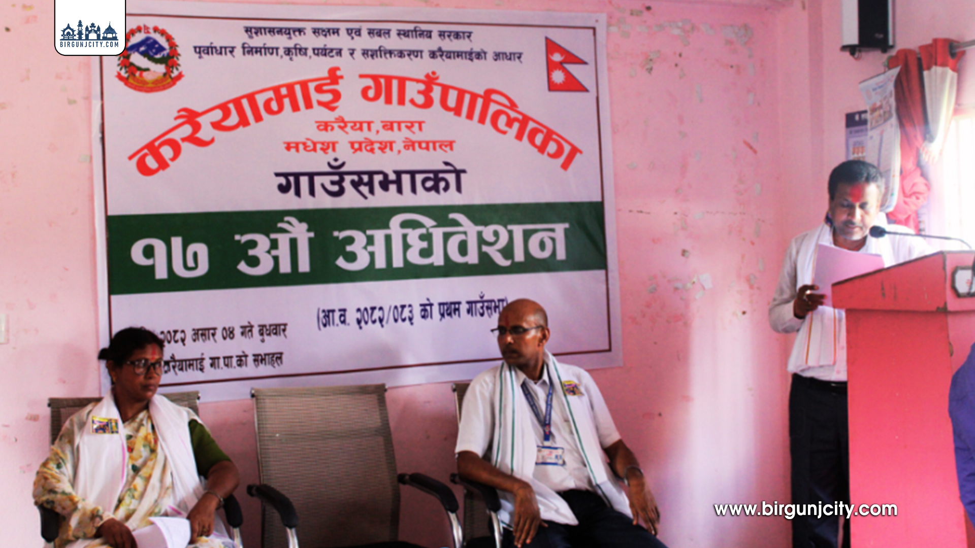 बाराको करैयामाई गाउँपालिकाले बुधबार आगामी आर्थिक वर्ष २०८२/०८३ का लागि नीति, कार्यक्रम तथा बजेट सार्वजनिक गरेको छ। शिक्षा, संस्कृति, युवा तथा खेलकुद, स्वास्थ्य, पूर्वाधार, कृषि र सामाजिक सुरक्षा जस्ता क्षेत्रहरूलाई विशेष प्राथमिकता दिँदै बजेट प्रस्तुत गरिएको हो ।