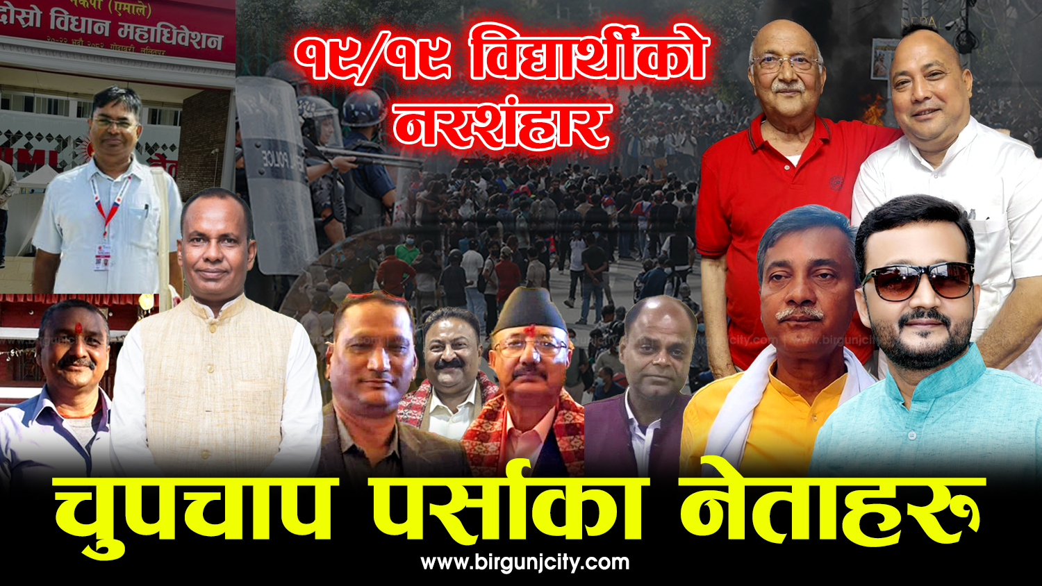 नागरिककाे समान्य आक्रोशमा थुनाइदिने सत्ता र शक्तिको आडमा रमाइरहेका पर्साका नेताहरू १९/१९ जना विद्यार्थीको नरशंहारमा मौन भएका छन् ।